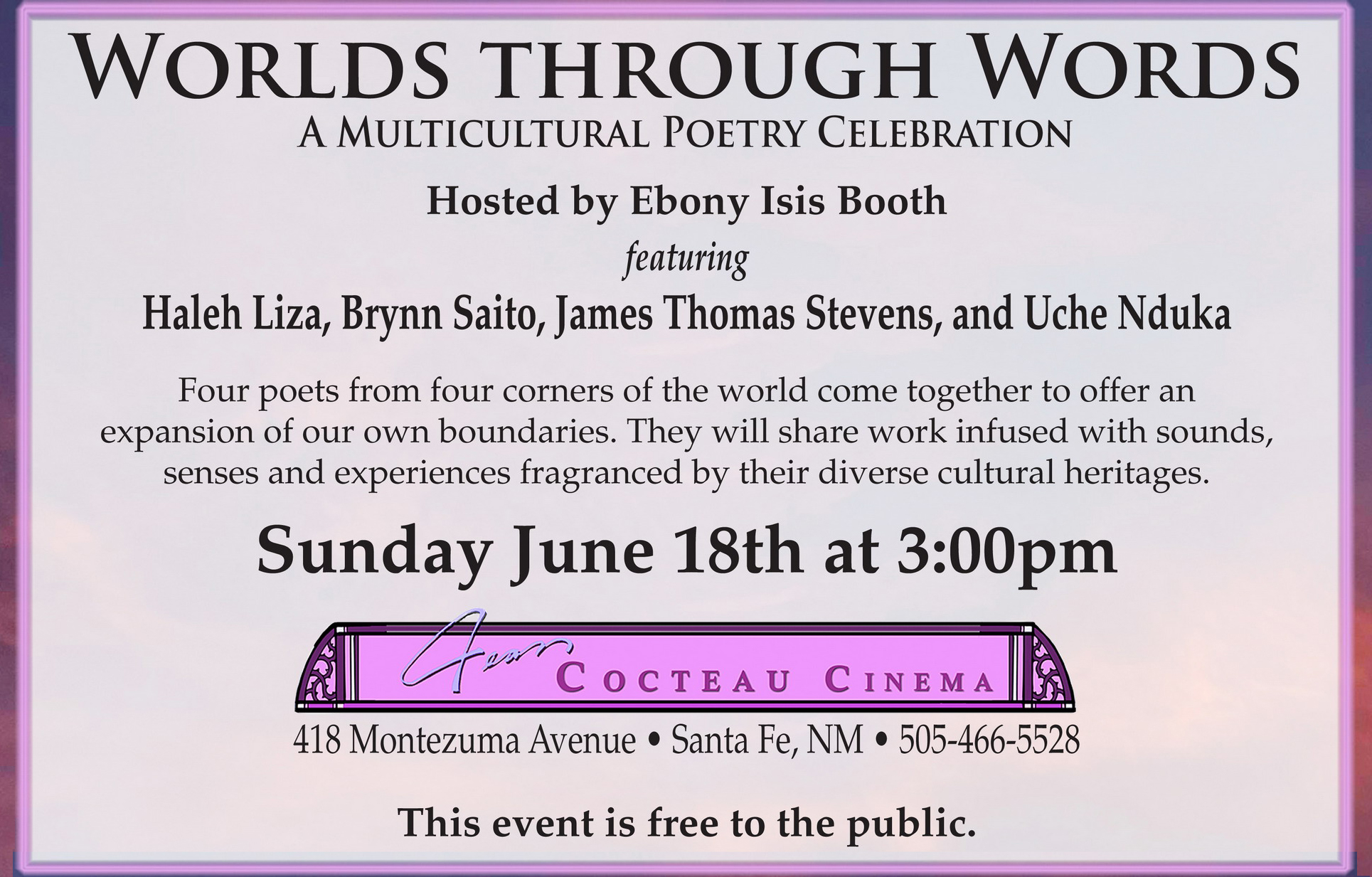 , James Thomas Stevens and Uche Nduka. Five poets with roots from many corners of the world come together to offer an expansion of our own boundaries. They will be sharing original work infused with sounds, senses and experiences fragranced by their diverse cultural heritages.